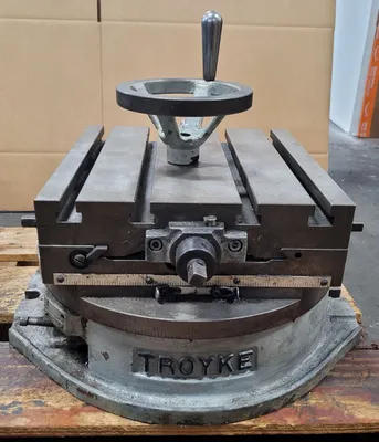 THE TROYKE DMT-15 IS A CROSS-SLIDE ROTARY TABLE DESIGNED FOR PRECISION MACHINING APPLICATIONS. IT FEATURES A 12" X 12" TABLE SURFACE EQUIPPED WITH T-SLOTS, ALLOWING FOR SECURE MOUNTING OF FIXTURES. THE TABLE OFFERS MANUAL 360-DEGREE ROTATION, PROVIDING VERSATILITY IN POSITIONING WORKPIECES FOR MILLING AND DIVIDING TASKS. THE CROSS-SLIDE FUNCTIONALITY ENABLES IN/OUT AND LEFT/RIGHT TRAVEL, ENHANCING THE TABLE'S ADAPTABILITY FOR VARIOUS MACHINING OPERATIONS. THE DMT-15 CAN BE MOUNTED EITHER HORIZONTALLY OR VERTICALLY, FURTHER INCREASING ITS UTILITY IN DIVERSE MACHINING SETUPS. THIS ROTARY TABLE IS AN IDEAL CHOICE FOR APPLICATIONS REQUIRING PRECISE CONTROL AND RELIABLE PERFORMANCE.