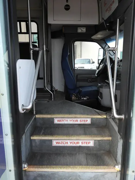 Has dents and scrapes typical of a used passenger bus. (Most of the city vehicles are stored outside so they may/or may not have hail damage).