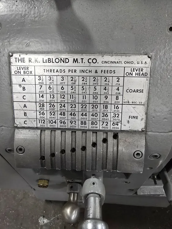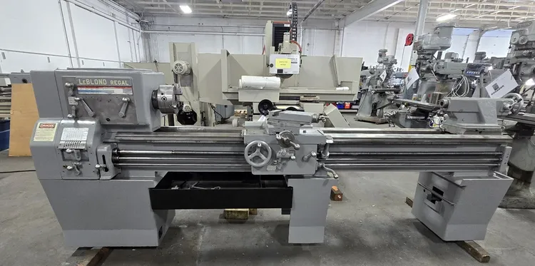 THIS LEBLOND REGAL IS A 19" X 78" ENGINE LATHE. ITS TECHNICAL CAPABILITIES INCLUDE A 19-1/2" SWING OVER WAYS AND A 12-1/4" SWING OVER THE CROSS SLIDE, WITH A GENEROUS 78" DISTANCE BETWEEN CENTERS. THE MACHINE IS EQUIPPED WITH A 10 HORSEPOWER MOTOR. THE SPINDLE OFFERS TWELVE SPEEDS RANGING FROM 38 TO 1500 RPM. OPERATORS HAVE ACCESS TO FORTY-EIGHT FEED SETTINGS, FROM .002 TO .116 INCHES PER REVOLUTION (IPR), AND FORTY-EIGHT THREAD SETTINGS, COVERING 2 TO 112 THREADS PER INCH (TPI). THE SPINDLE HOLE DIAMETER MEASURES 1-49/64". STANDARD FEATURES AND INCLUDED ACCESSORIES CONSIST OF A BISON 3-JAW CHUCK, A 5C COLLET CLOSER, HARDEN REPLACEABLE WAYS, A THREAD DIAL, A CHIP PAN, AND A TAIL STOCK.