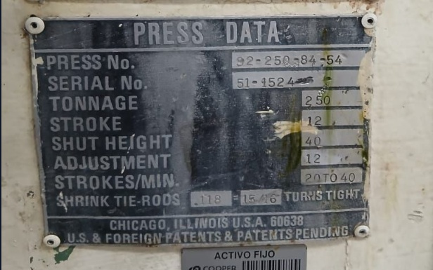 THE U.S.I CLEARING MECHANICAL PRESS NO. S2-250-84-54, FEATURES A 250-TON CAPACITY AND A 12-INCH STROKE. THE MACHINE IS DESIGNED WITH A 40-INCH SHUT HEIGHT AND PROVIDES 12 INCHES OF ADJUSTMENT. OPERATING AT A VARIABLE SPEED RANGING FROM 20 TO 40 STROKES PER MINUTE, THE UNIT UTILIZES SHRINK TIE-RODS SPECIFIED AT .118, REQUIRING 15/16 TURNS TIGHT FOR PROPER SETUP.