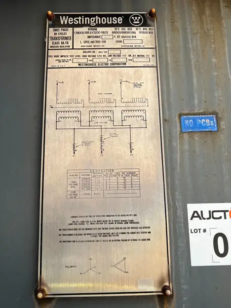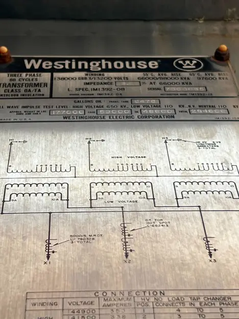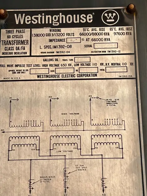 THREE PHASE 60 CYCLES TRANSFORMER CLASS OA/FA INSULDUR INSULATION, 138000 GRD.Y/13200 VOLTS, 66000/88000KVA, 97600KVA, L.SPEC. IMI392-08