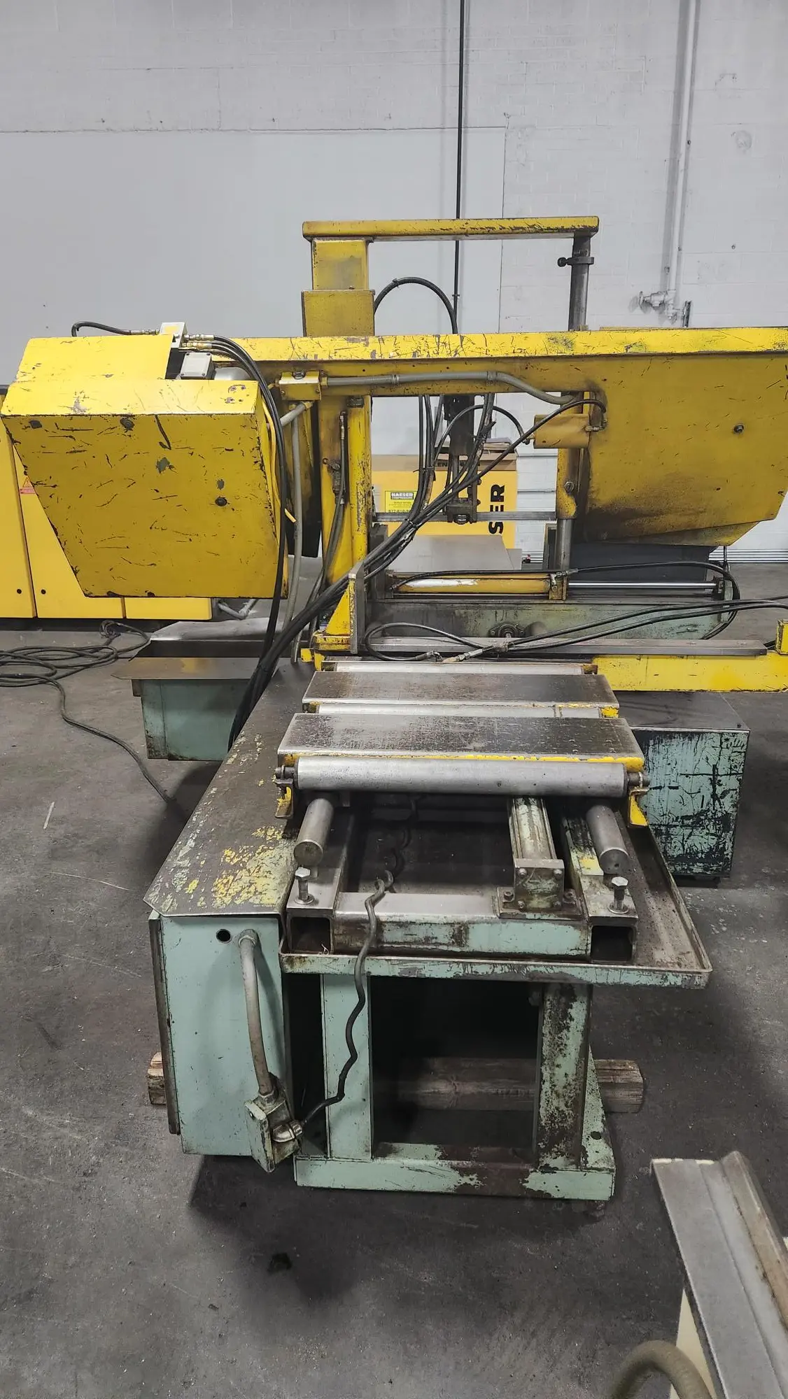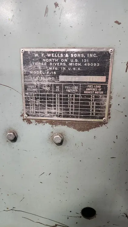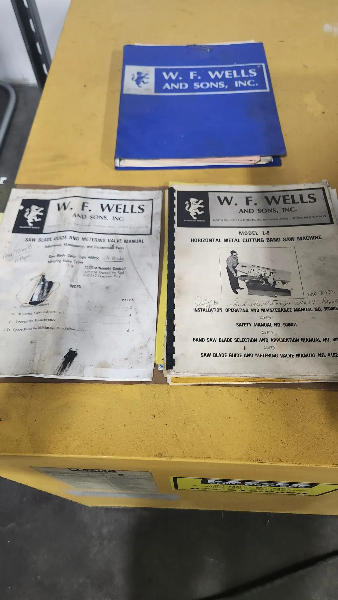 THE W.F. WELLS F-15 AUTOMATIC HORIZONTAL BAND SAW IS DESIGNED FOR HIGH-CAPACITY METAL CUTTING. POWERED BY A 3 HP MOTOR, THIS AUTOMATIC SAW OFFERS A RECTANGULAR CUTTING CAPACITY OF 15 INCHES HIGH BY 17 INCHES WIDE, AND A ROUND CAPACITY OF 15 INCHES. IT FEATURES A VARIABLE BLADE SPEED RANGE OF 75-300 FPM AND A BLADE CUTTING FORCE CONTROL ADJUSTABLE BETWEEN 20 AND 80 LBS. THE MACHINE UTILIZES A 1-INCH WIDE, 0.35-INCH THICK BLADE WITH A LENGTH OF 173 INCHES (14'-5") AND PROVIDES A MAXIMUM CLEARANCE UNDER THE BLADE OF 16 INCHES. CONSTRUCTED WITH A TWIN POST DESIGN, THE F-15 IS EQUIPPED WITH A HYDRAULIC BAR FEED WITH MULTIPLE INDEXING, CAPABLE OF A SINGLE INDEX LENGTH FROM 1/8 INCH UP TO 24 INCHES. FURTHER FEATURES INCLUDE HYDRAULIC BLADE TENSION, A BLADE BRUSH, AND A COOLANT SYSTEM, WITH THE UNIT HAVING AN APPROXIMATE WEIGHT OF 1,750 LBS.