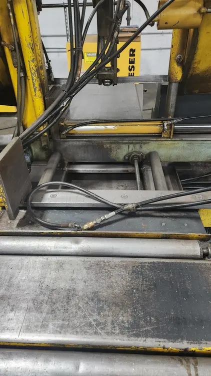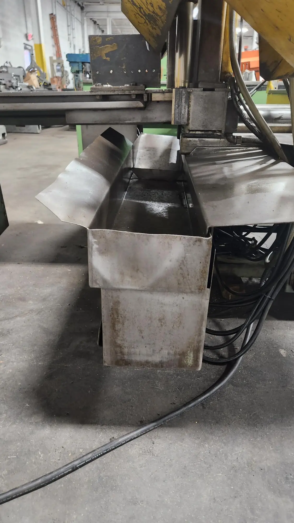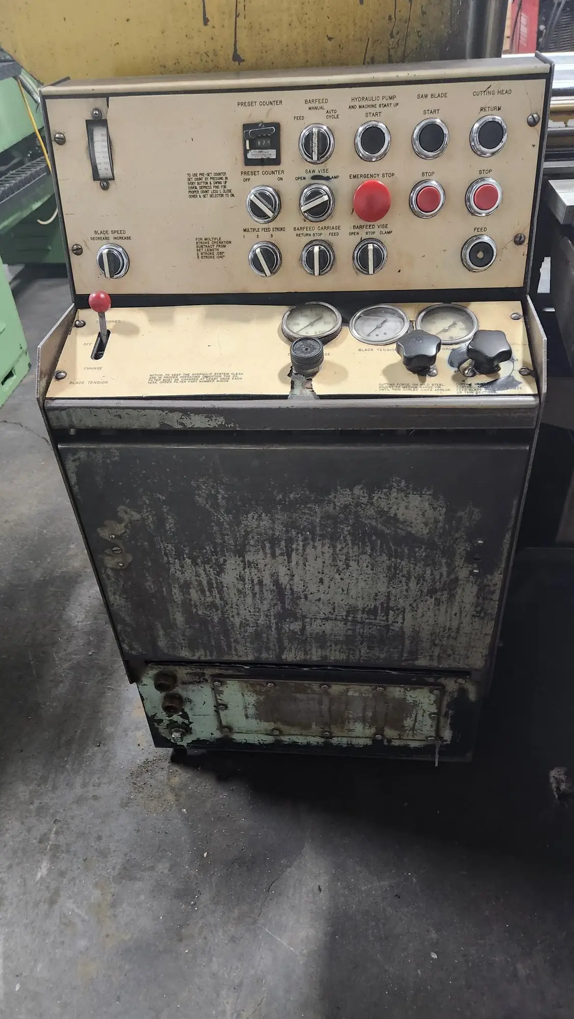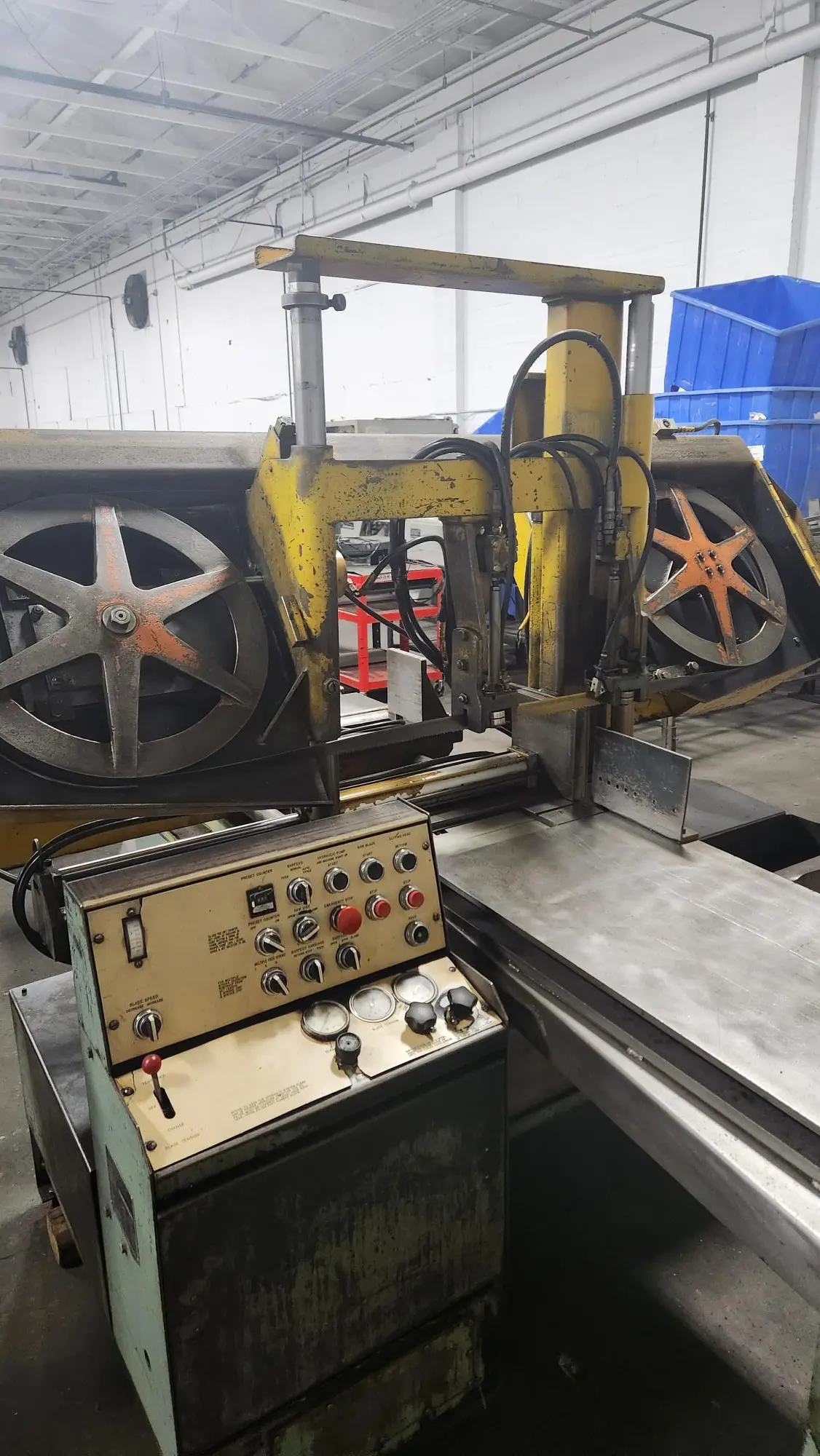 THE W.F. WELLS F-15 AUTOMATIC HORIZONTAL BAND SAW IS DESIGNED FOR HIGH-CAPACITY METAL CUTTING. POWERED BY A 3 HP MOTOR, THIS AUTOMATIC SAW OFFERS A RECTANGULAR CUTTING CAPACITY OF 15 INCHES HIGH BY 17 INCHES WIDE, AND A ROUND CAPACITY OF 15 INCHES. IT FEATURES A VARIABLE BLADE SPEED RANGE OF 75-300 FPM AND A BLADE CUTTING FORCE CONTROL ADJUSTABLE BETWEEN 20 AND 80 LBS. THE MACHINE UTILIZES A 1-INCH WIDE, 0.35-INCH THICK BLADE WITH A LENGTH OF 173 INCHES (14'-5") AND PROVIDES A MAXIMUM CLEARANCE UNDER THE BLADE OF 16 INCHES. CONSTRUCTED WITH A TWIN POST DESIGN, THE F-15 IS EQUIPPED WITH A HYDRAULIC BAR FEED WITH MULTIPLE INDEXING, CAPABLE OF A SINGLE INDEX LENGTH FROM 1/8 INCH UP TO 24 INCHES. FURTHER FEATURES INCLUDE HYDRAULIC BLADE TENSION, A BLADE BRUSH, AND A COOLANT SYSTEM, WITH THE UNIT HAVING AN APPROXIMATE WEIGHT OF 1,750 LBS.