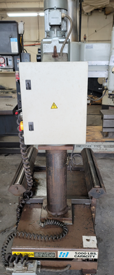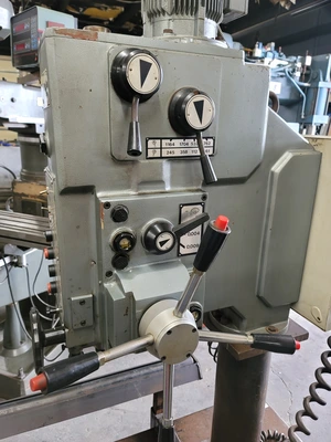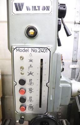 THE WILTON 2401 GEARED HEAD DRILL PRESS IS EQUIPPED WITH A 2 HP MOTOR AND FEATURES AN 8-SPEED RANGE, OFFERING SPEEDS OF 112, 160, 245, 358, 532, 762, 1164, AND 1704 RPM. IT IS DESIGNED FOR HEAVY-DUTY APPLICATIONS WITH A CAST IRON DRILLING CAPACITY OF 1-1/2 INCHES AND A STEEL DRILLING CAPACITY OF 1-3/8 INCHES. THE DRILL PRESS ALSO SUPPORTS CAST IRON TAPPING UP TO 1-9/16 INCHES AND STEEL TAPPING UP TO 1-1/2 INCHES. THE MACHINE INCLUDES AUTOMATIC FEEDS WITH INCREMENTS OF .004, .007, AND .010 INCHES, ENHANCING ITS VERSATILITY FOR VARIOUS TASKS. THE SPINDLE TRAVEL IS 7 INCHES, AND THE SPINDLE CAN BE ADJUSTED TO A MINIMUM DISTANCE OF 11.4 INCHES AND A MAXIMUM DISTANCE OF 34 INCHES FROM THE TABLE. THE DRILL PRESS HAS A MORSE TAPER NO. 4 AND A COLUMN DIAMETER OF 6.88 INCHES. IT OPERATES ON A 220/240V, 3-PHASE POWER SUPPLY. THE CUSTOM TABLE WITH ROLLERS SUPPORTS A LOAD CAPACITY OF UP TO 5,000 POUNDS, MAKING IT SUITABLE FOR DEMANDING INDUSTRIAL APPLICATIONS. THE DRILL PRESS CAN DRILL TO A CENTER DISTANCE OF 28 INCHES, PROVIDING AMPLE SPACE FOR LARGE WORKPIECES.