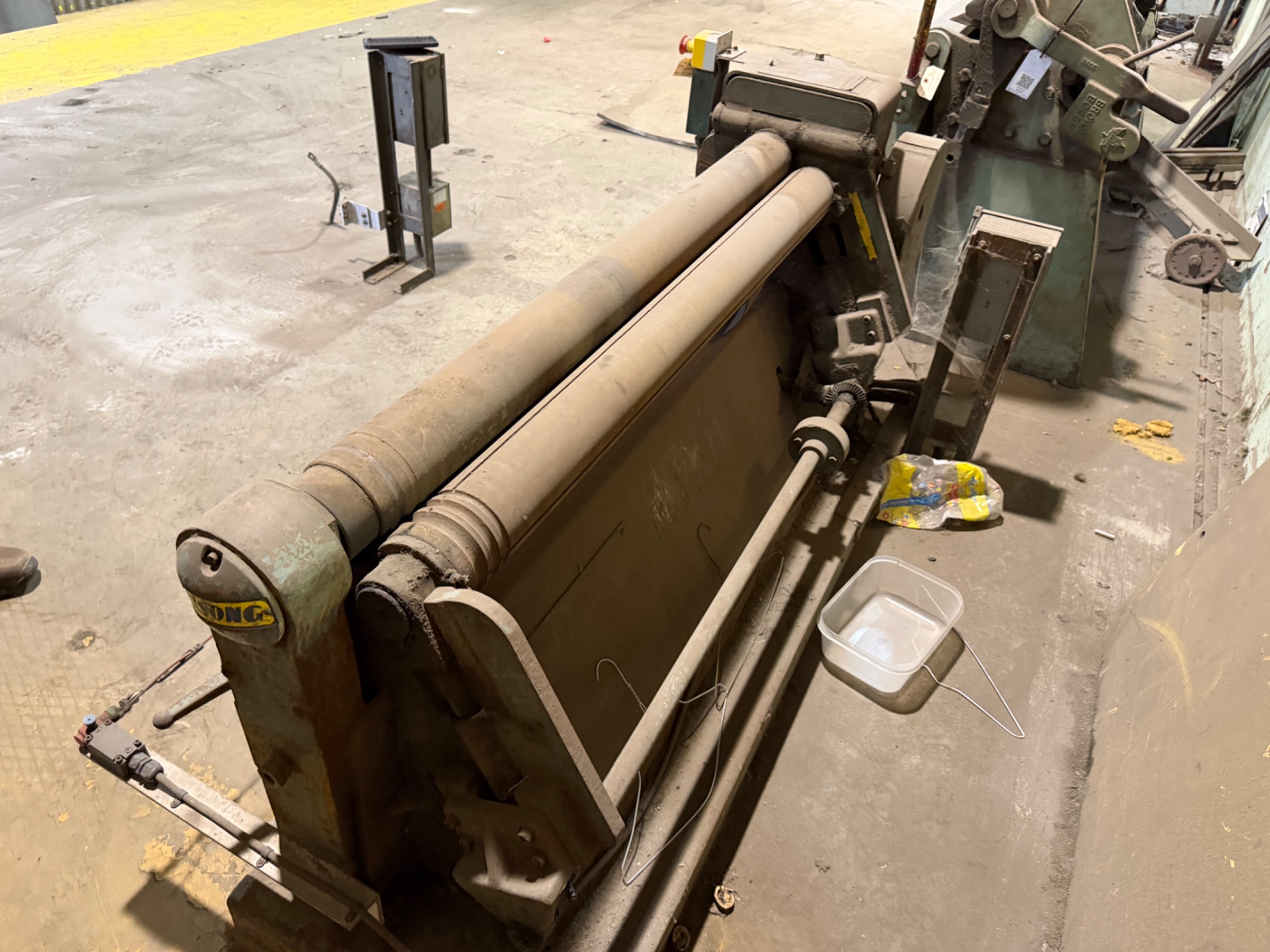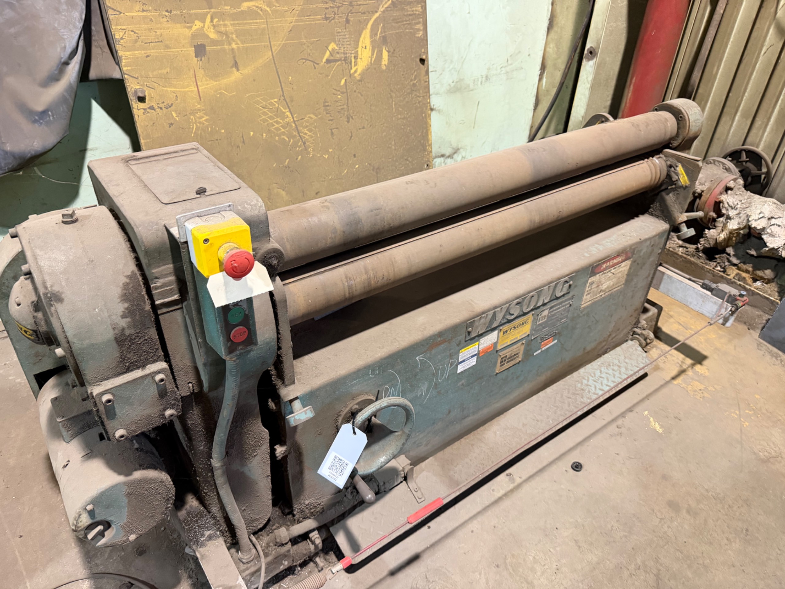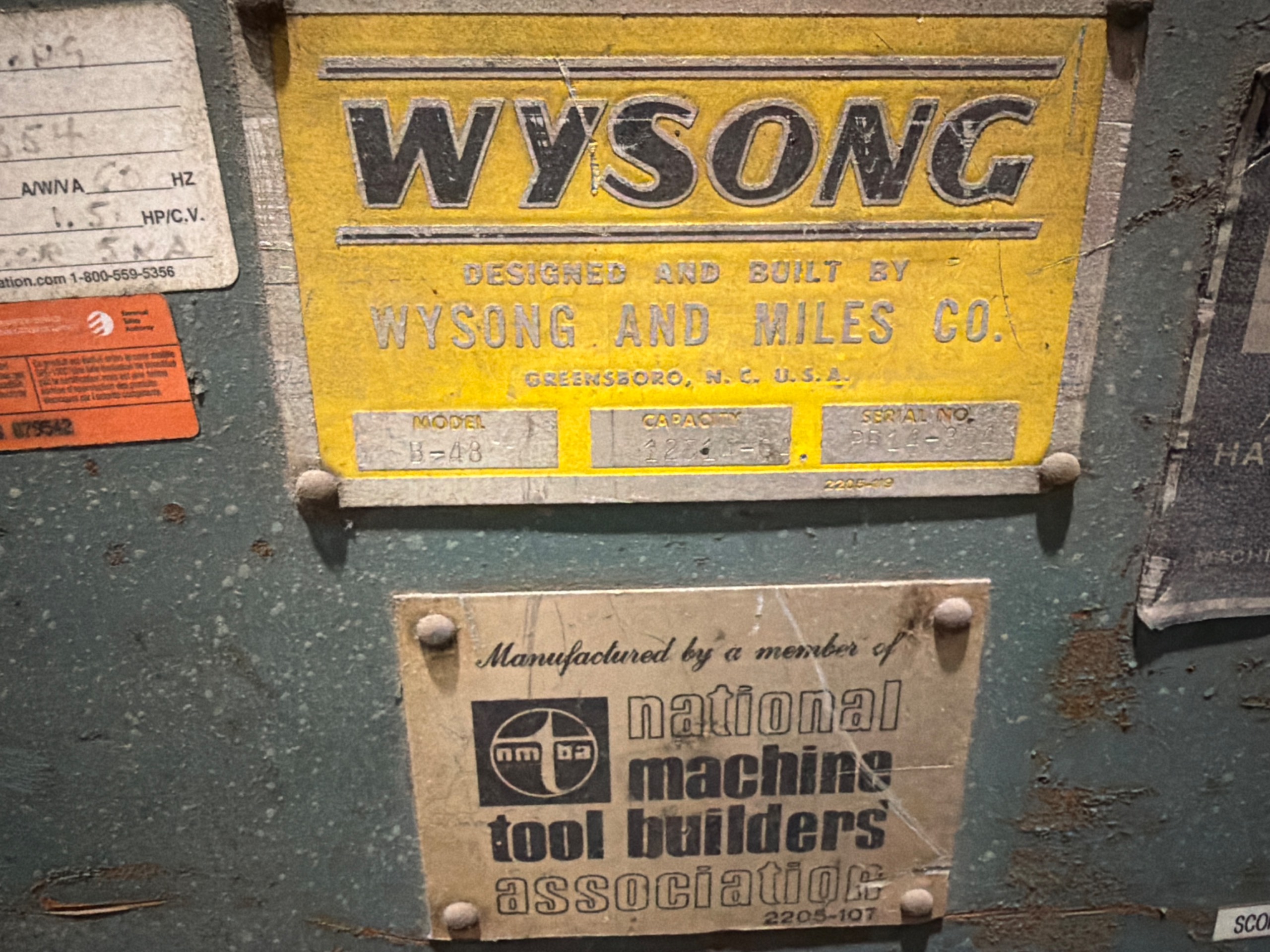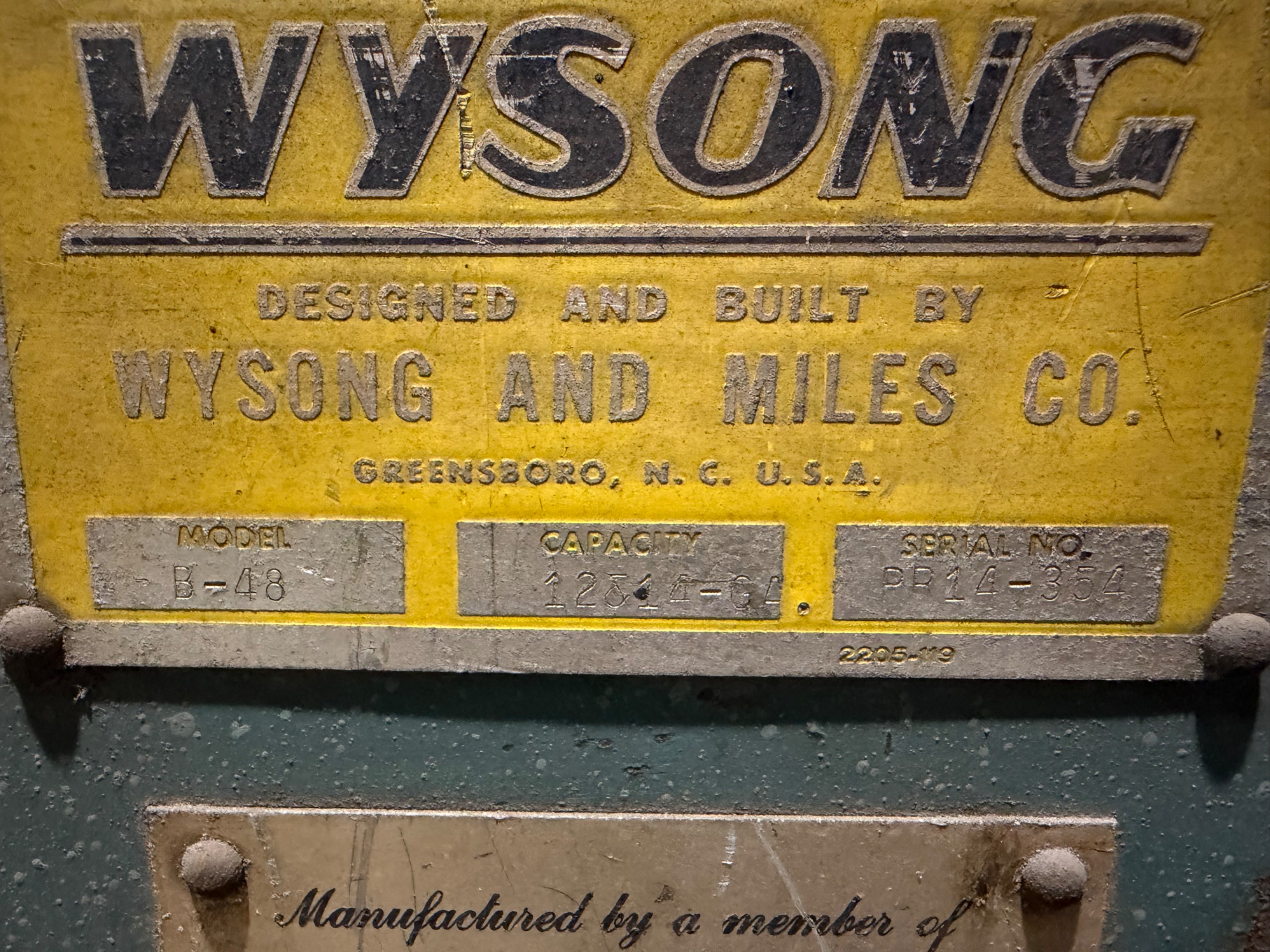 THE WYSONG AND MILES MODEL B-48 IS A MECHANICAL INITIAL PINCH-TYPE SLIP ROLL DESIGNED FOR PRECISION METAL BENDING AND FORMING APPLICATIONS. THIS THREE-ROLL DRIVE MACHINE FEATURES A 48-INCH ROLLING LENGTH AND IS TYPICALLY RATED FOR A MAXIMUM CAPACITY OF 12-GAUGE TO 14-GAUGE MILD STEEL. THE ROLLS MEASURE 4.25 INCHES IN DIAMETER AND OPERATE AT A CONSTANT SPEED OF APPROXIMATELY 18 FEET PER MINUTE. STANDARD TECHNICAL FEATURES INCLUDE AN AIR-OPERATED DROP END FOR EFFICIENT CYLINDRICAL PART REMOVAL AND A LONGITUDINAL GROOVE IN THE REAR AND BOTTOM ROLLS TO FACILITATE WIRE FORMING.
