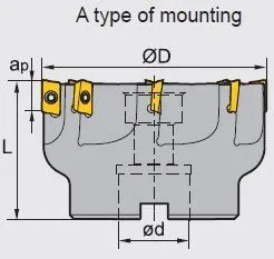 THE ZCC CT EMP02-5.00”-B1.50” AP16-08 IS A SQUARE SHOULDERING INDEXABLE FACE MILL DESIGNED BY ZHUZHOU CUTTING TOOLS. THIS TOOL FEATURES A TYPE A MOUNTING SYSTEM AND IS EQUIPPED WITH 8 TEETH, PROVIDING EFFICIENT MATERIAL REMOVAL AND A SMOOTH FINISH. THE FACE MILL HAS A CUTTING DIAMETER (D) OF 5.00 INCHES, A BORE DIAMETER (D) OF 1.50 INCHES, AND AN OVERALL LENGTH (L) OF 2.40 INCHES. IT IS ENGINEERED WITH A CUTTING DEPTH (AP) OF 0.630 INCHES, ALLOWING FOR SUBSTANTIAL MATERIAL ENGAGEMENT. THE TOOL IS DESIGNED WITH A CUTTING EDGE ANGLE (KR) OF 90°, WHICH IS OPTIMAL FOR SQUARE SHOULDER MILLING APPLICATIONS, ENSURING PRECISE AND ACCURATE CUTS. THIS FACE MILL IS SUITABLE FOR VARIOUS MACHINING OPERATIONS, OFFERING VERSATILITY AND RELIABILITY IN DEMANDING INDUSTRIAL ENVIRONMENTS.